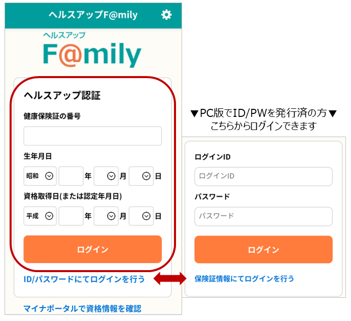「健康保険の資格情報」または「ログインID/パスワード」を入力し、ログインをタップ